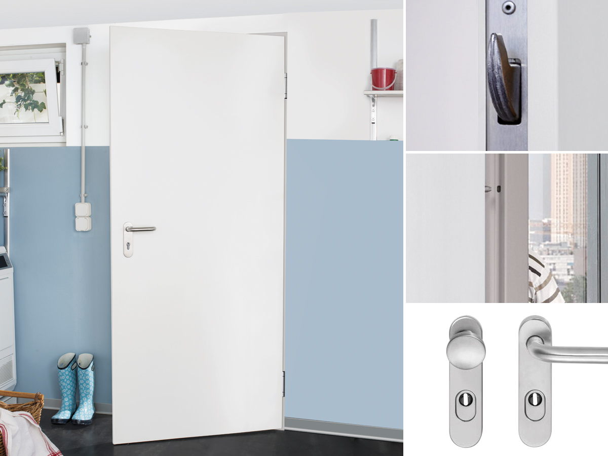 - Multifunktionstüren mit Antipanikschlossvarianten nach DIN EN 179 und DIN EN 1125 mit zahlreichen Beschlagausstattungen